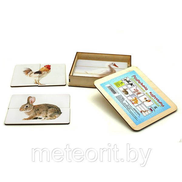 Набор из 6 ярких крупных картинок размером 15*12 см, на которых изображены домашние животные: корова, свинья, гусь и др. Картинки разрезаны на 2, 3 или 4 части и упакованы в деревянную коробку. Малышу необходимо подобрать подходящую по количеству и размеру деталей картинку, чтобы получилось одно целое изображение дикого животного.