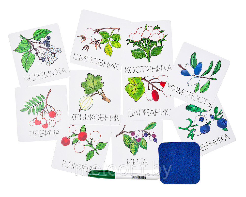 Обводите картинки и их названия на многоразовых карточках маркером, стирайте с помощью сухой салфетки, вложенной в набор.