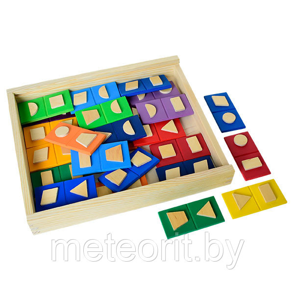 Домино Геометрические фигуры состоит из фанерных табличек – игральных карточек. На окрашенных карточках–табличках прикреплены по 2 геометрические формы - фигуры неокрашенные . Геометрические формы–фигуры представляют собой квадраты, круги, треугольники и прямоугольники, возвышающиеся над поверхностью карточки. Все карточки–таблички уложены в фанерную коробку с крышкой–задвижкой. Суть игры заключается в том, чтобы продолжить цепочку карточек, найдя такую же как предыдущая по форме и по цвету.