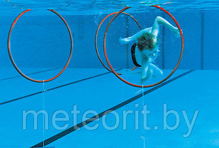 Слалом кольца создают под водой тоннель в который можно проныривать. Глубина расположения колец регулируется длиной веревки, соединяющей плавающее вертикально под водой кольцо со стоящим на дне грузом. С помощью четырех колец входящих в данный набор можно обустроить интересную трассу и научить детей проныривать через одно или несколько колец сразу, а комбинируя слалом-кольца с тонущими игрушками и слалом-арками (Которые ставятся на дно) можно получить подводную трассу практически любой сложности. Диаметр кольца 70 см., материал - пластик. В наборе 4 кольца разных цветов с грузами и веревками. Производство Россия.