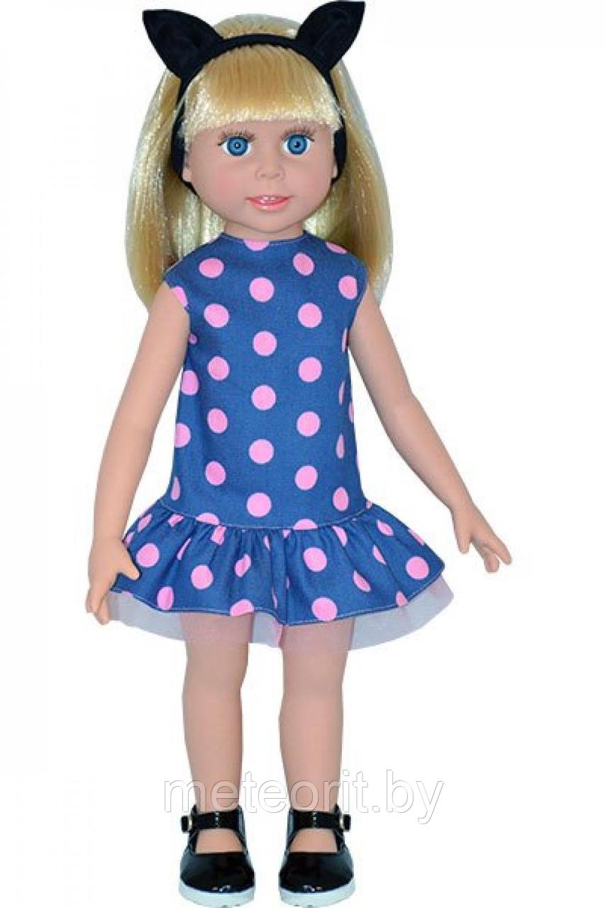 Яна – милая, очаровательная кукла-девочка,с выразительными глазками. Глаза у куклы вставные не закрывающиеся, с пушистыми ресничками. Волосы куклы очень похожи на натуральные, прошиты по всему контуру головы, их можно расчесывать и укладывать в различные прически. Руки и ноги куклы могут вращаться . Кукла может стоять и сидеть на горизонтальной поверхности. В наряд куклы входит: платье, пальто, обувь.