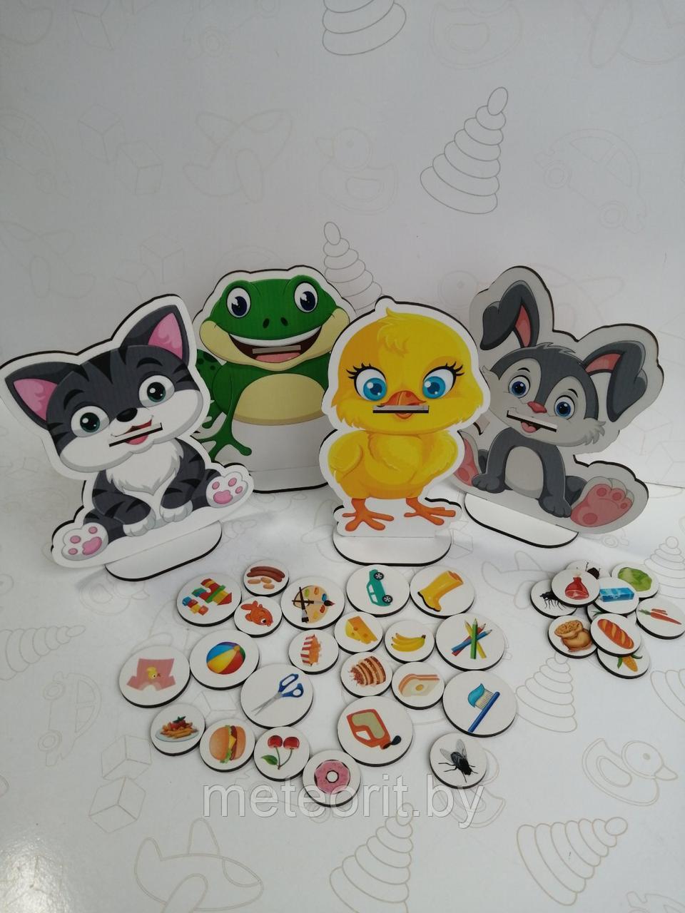 Игра станет отличным тренажером по усвоению понятий "Съедобное-несъедобное". Разложите перед ребенком всю пищу и попросите его назвать все, что видит на картинках. Теперь можно кормить, давать то, что съедобно, и отложить в сторону, несъедобное. если ребенок засомневается и все же поднесет на ложечке, например, резиновые сапоги, не торопитесь его останавливать: фишки несъедобного больше ротовой полости персонажей, и они туда не войдут.