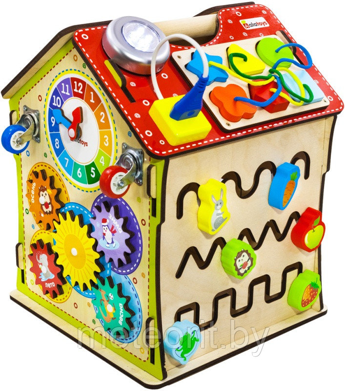 На стенах бизидома вы увидите разнообразные лабиринты, колесики, шестеренки, циферблат со стрелками, колокольчик, дверцы с разнообразными замками, молнии и шнуровки. На крыше дома вы увидите сортер с разноцветными цифрами и геометрическими фигурами, розетку и светильник.