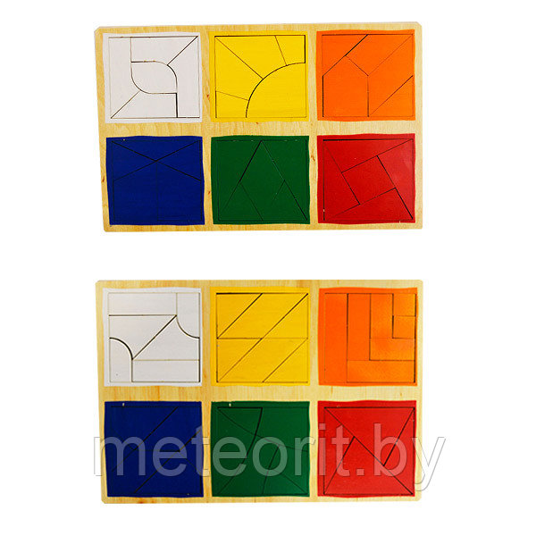 3-й уровень игры "Сложи квадрат" включает в себя деревянный планшет с 6 квадратами, состоящими из 4-7 частей.