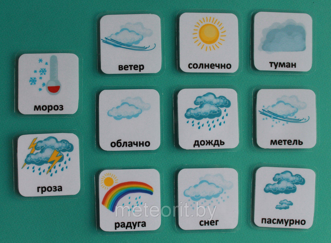 В набор входят карточки: солнечно, облачно, ветер, туман, дождь, радуга, пасмурно, снег, мороз, гроза, метель.