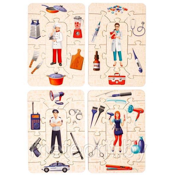 Пазл “Ассоциации. Профессии” - дидактическое пособие, которое позволит ребенку познакомиться с миром профессий, расширить кругозор и примерить на себя роли полицейского, повара, врача и парикмахера! Как играть? Набор состоит из четырех пазлов. Каждый из них посвящен определенной профессии и разделен на части. Задача ребенка - подобрать к каждой профессии верные ассоциации. Перед тем, как начать игру, рассмотрите вместе с ребенком четырех главных персонажей, обсудите их деятельность и значение в жизни общества, а затем разложите части пазла в хаотичном порядке и предложите ребенку найти для каждого предмета свое место. Обращайте внимание малыша на то, для чего нужна та или иная вещь в профессиональной деятельности. Обсудите вместе с ребенком, какие детали можно было бы добавить дополнительно. Пазл приоткрывает мир профессий, предлагая наглядно познакомиться с внешним обликом специалистов, трудовыми функциями и необходимыми в работе принадлежностями. А процесс поиска и соединения деталей друг с другом развивает мелкую моторику и логическое мышление. Открывать мир интересно, если играть вместе с нами!