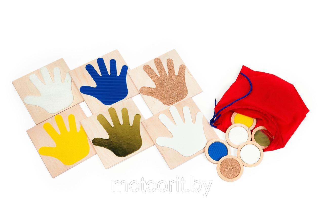 На игровой панели размером 35х25 см помещены 6 ладошек из разных материалов: наждачной бумаги, пробкового материала, фольги гладкой и ребристой, сукна и пластика — различной фактуры — гладкие, колючие, рифленые, шершавые. Кроме этого имеются 6 аналогичных ладошек на шести отдельных фанерных квадратах размером 11,5х11,5 см.